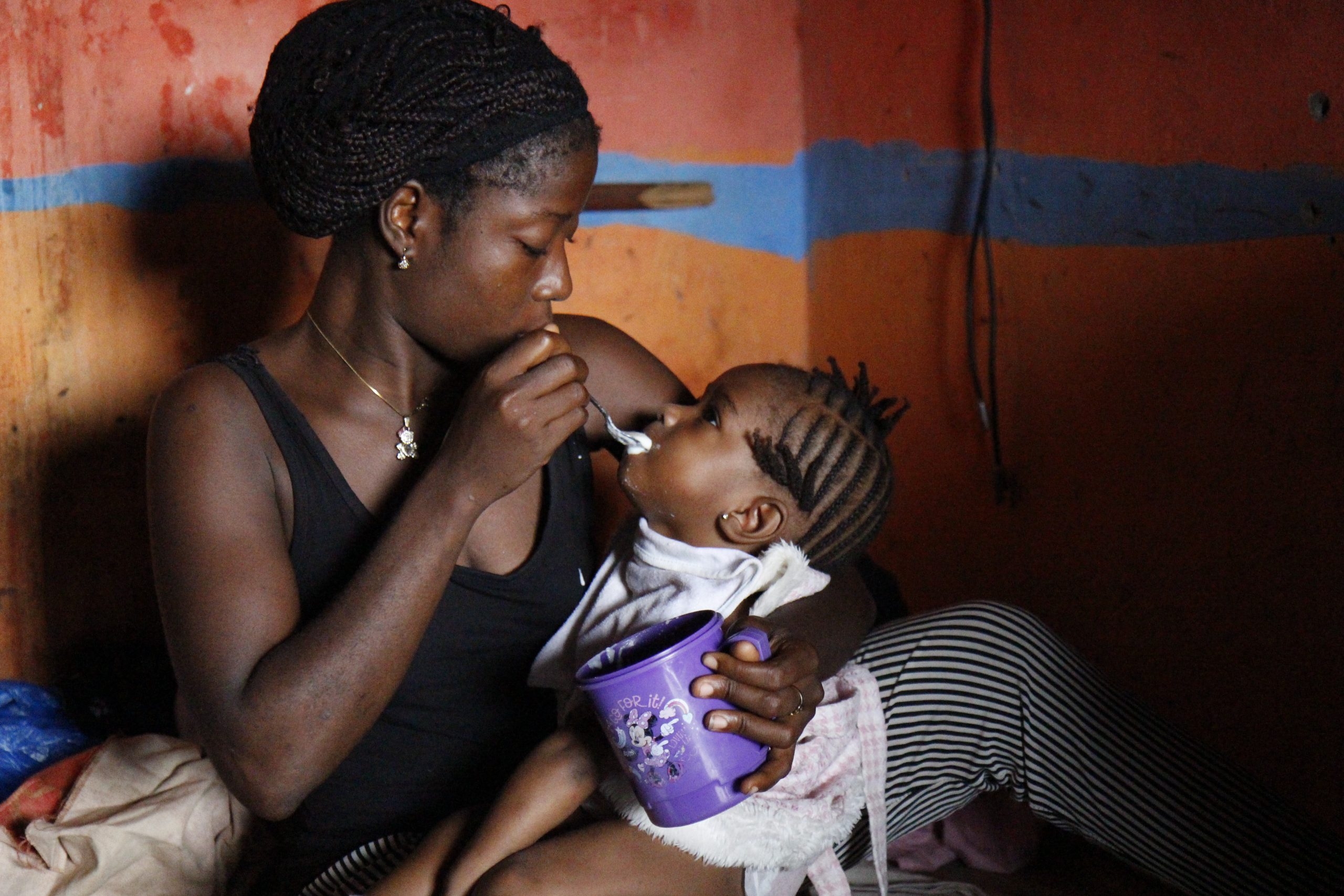 Pal voor haar deur, ziet Ramatu kinderen samen spelen. Als ze over haar schouder kijkt, ziet ze haar dochter Annabel (3). Die ligt op een versleten matrasje, verscholen in hun donkere kamertje.